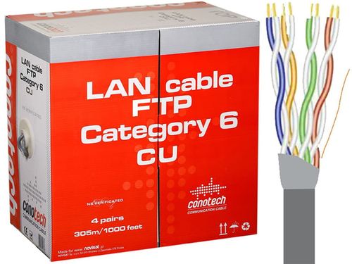 Wysokiej jakości kabel sieciowy, ekranowany FTP kat.6, składa się z czterech par przewodów skręconych asymetrycznie wykonanych z czystej miedzi, oddzielonych od siebie przy pomocy separatora krzyżowego. Jego zastosowanie powoduje zmniejszenie zakłóceń występujących pomiędzy parami żył. Natomiast do ich izolacji został użyty jednolity polietylen HDPE, który cechuje się podwyższoną gęstością oraz szczególnie wysoką izolacją dielektryczną. Skrętka komputerowa posiada aluminiowy ekran i stalowe, miedziowane uziemienie zwiększające niewrażliwość na elektromagnetyczne zakłócenia w transmisji sygnału. Powłoka wykonana jest z polwinitu PCV w kolorze szarym o średnicy zewnętrznej Ø6,30 ± 0,02 mm, która pełni funkcję ochronną przed uszkodzeniami mechanicznymi oraz umożliwia szybkie i trwałe prowadzenie kabla. Przewód o długości 305m pakowany jest w karton typu Easy Pull Box, ułatwiający jego stosowanie oraz posiada znacznik metrowy, określający stopień wykorzystania.