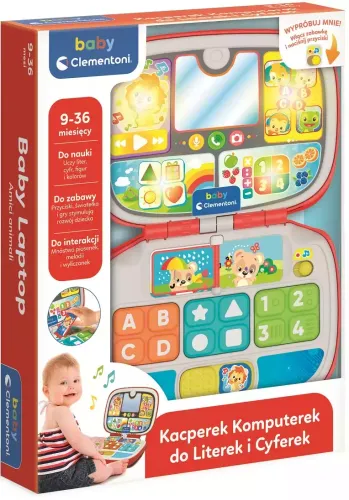 Świat dorosłych staje się ciekawy i zabawny. Dzięki laptopowi zaprojektowanemu specjalnie dla nich, dzieci mogą się utożsamić i naśladować przykłady, z którymi stykają się na co dzień w domu. Efekty świetlne, lustro do obserwacji własnego odbicia, robienia min i kojarzenia ich ze swoimi emocjami, realistyczne dźwięki i design prawdziwego laptopa pozostawiają otwarte pole dla wyobraźni. Dzięki 5 edukacyjnym i interaktywnym zajęciom dziecko może prowadzić wideorozmowy z przyjaciółmi zwierzakami, słuchać muzyki, oglądać zdjęcia w galerii lub wykonywać obliczenia za pomocą kalkulatora. Tak jak prawdziwy laptop, zabawka posiada wiele przycisków, które aktywują efekty świetlne na ekranie, bo zabawa to dla dzieci nie lada praca! Lekki, solidny i idealny do noszenia zawsze przy sobie. Uczy pierwszych liter, kształtów, liczb, kolorów przedstawionych owoców i wielu słówek przy pomocy wesołych piosenek i rymowanek.