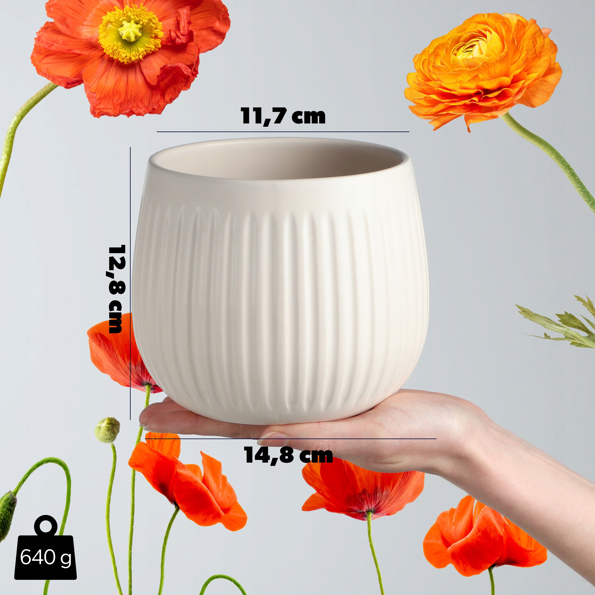 Osłonka o średnicy 14 cm wykonana jest z wysokiej jakości ceramiki, co zapewnia jej wytrzymałość i elegancję. Jej minimalistyczny, klasyczny kształt w połączeniu z delikatnymi, pionowymi wgłębieniami nadaje jej niepowtarzalnego charakteru. Ta nowoczesna doniczka będzie idealnie komponować się zarówno w nowoczesnych, jak i klasycznych wnętrzach, wnosząc do nich odrobinę stylu.