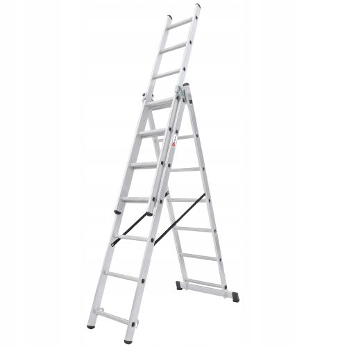 ?Składa się z trzech segmentów, dzięki którym wybierając jedną drabinę otrzymujesz możliwość uzyskania drabiny przystawnej, rozstawnej lub wolnostojącej z wysuniętym trzecim elementem.