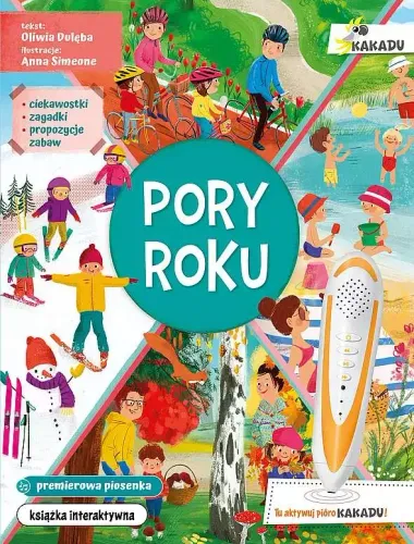Wyjątkowa książka interaktywna z piórem Kakadu, które uruchamia zakodowane na stronach teksty i dźwięki. Publikacja jest częścią innowacyjnego systemu nauki i zabawy w jednym. Mały czytelnik oglądając piękne i pełne szczegółów ilustracje Anny Simeone, poznaje kolejne pory roku. Słucha ciekawych informacji, obserwuje budzącą się do życia przyrodę, słyszy głosy ptaków i szum rzeki, towarzyszy bohaterom na wakacjach, wyrusza z nimi na spacer do jesiennego lasu, uczestniczy w przygotowaniach do świąt i słucha kolędy. Dzięki odkrywaniu nazw poszczególnych elementów ilustracji i słuchaniu tekstów dziecko rozwija mowę i wzbogaca słownictwo. Co więcej, na każdej stronie może sprawdzić swoją pamięć i spostrzegawczość, odpowiadając na pytania. Książka zawiera również ciekawostki i instrukcje kreatywnych zabaw. Do książki nie jest dołączone pióro Kakadu, które trzeba zakupić osobno. Wyjątkową atrakcją jest premierowa piosenka z podkładem muzycznym, którą dziecko może śpiewać samo lub z pomocą dorosłego. Na uwagę zasługuje świetna oprawa lektorska. Pozostałe tytuły książek Kakadu: • Widzę, słyszę, poznaję. Zwierzęta domowe • Widzę, słyszę, poznaję. Zwierzęta świata • Angielski słowniczek obrazkowy