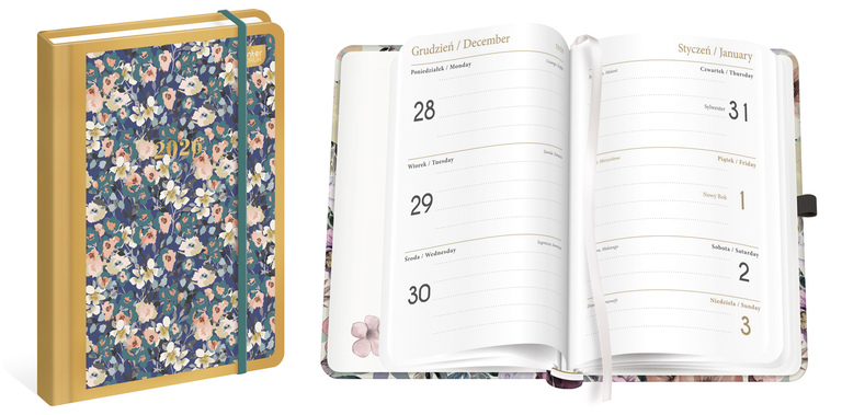 Elegancki Kalendarz Książkowy B6 w kolorze Metallic Meadow na rok 2026 to idealne narzędzie do organizacji czasu, zaprojektowane z myślą o komfortowym użytkowaniu. Posiada 192 strony z matową okładką i efektownymi detalami, a także praktyczne dodatki, takie jak tasiemka do zaznaczania strony oraz gumka utrzymująca luźne notatki.