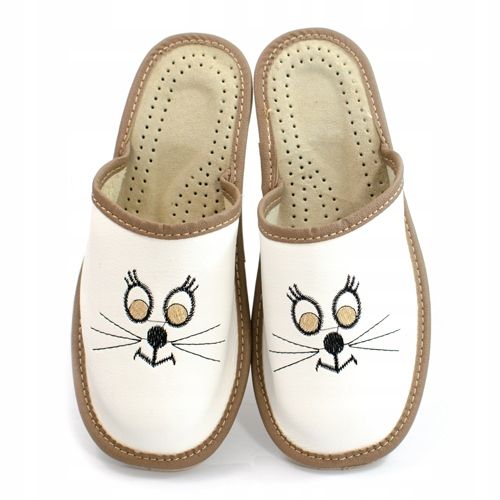 Oferujemy kapcie dziecięce z wyprofilowaną, skórzaną wkładką, które są idealnym połączeniem stylu, jakości oraz komfortu. Te eleganckie beżowe klapki zachwycają zarówno dzieci, jak i ich rodziców. Dzięki unikalnemu haftowanemu wzorowi z motywem kota, każdy maluch poczuje się w nich wyjątkowo.