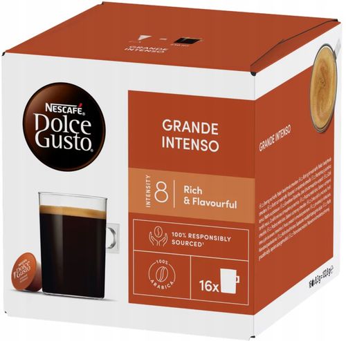 Kapsułki Nescafe Dolce Gusto Grande Intenso to wyjątkowa mieszanka 100% ziaren Arabiki, która zapewnia niezrównany, bogaty i intensywny smak. Każda kapsułka jest hermetycznie zamknięta, gwarantując zachowanie pełni aromatu i świeżości.