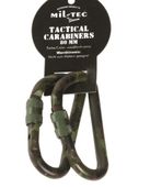 Karabinki w kamuflażu woodland wykonane z lekkiego aluminium. Zapinane są w sposób standardowy i dodatkowo zabezpieczone specjalną