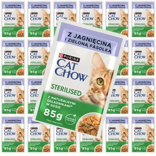 Purina Cat Chow Sterilised z jagnięciną i zieloną fasolką w sosie to pełnoporcjowa karma mokra opracowana specjalnie dla dorosłych kotów po zabiegu sterylizacji lub kastracji.
