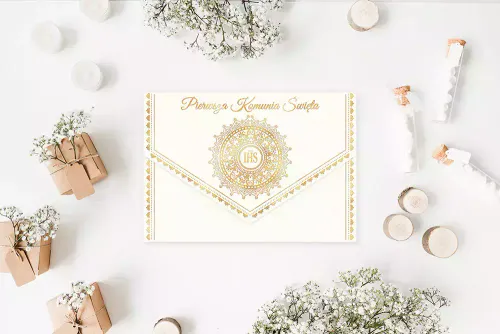 Karnet z kieszonką na pieniądze w formacie A5, składany z trzech. Złocony i tłoczony, teksy życzeń w środku. Wydrukowany na wysokiej jakości papierze. W zestawie koperta.