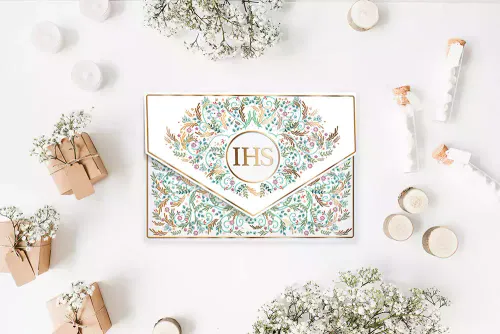 Karnet z kieszonką na pieniądze w formacie A5, składany z trzech. Złocony i tłoczony, teksy życzeń w środku. Wydrukowany na wysokiej jakości papierze. W zestawie koperta.