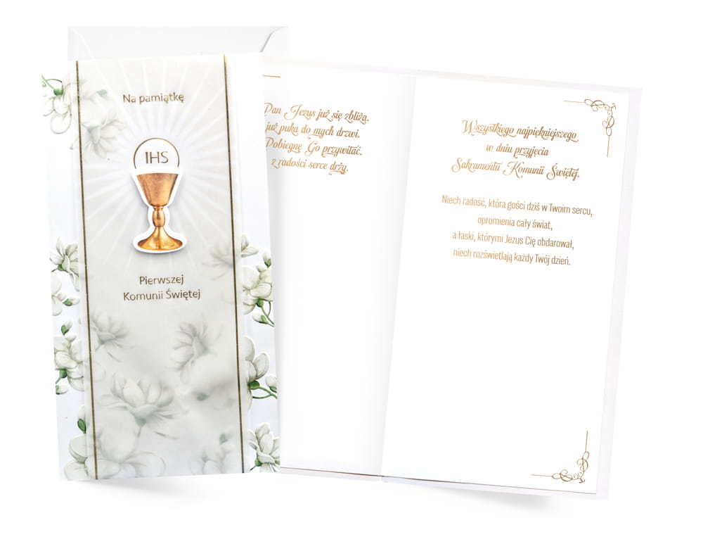 Karnet na I Komunię Świętą z serii Passion Moments PM-402 to unikalne połączenie estetyki i precyzji wykonania. Każda kartka w tej kolekcji wyróżnia się bogatymi zdobieniami, takimi jak: