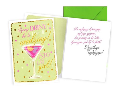 Kartka na Urodziny - Passion Premium z nadrukiem "Urodziny (drink)" o wymiarach B6 (16,6 cm x 11,7 cm po złożeniu). Kartki z serii Passion Premium to świetny pomysł na piękną pamiątkę, każda kartka jest zdobiona przynajmniej dwoma rodzajami uszlachetnień - metaliczne lub perłowe folie, brokat, tłoczenie itp. - tyle piękna w takim drobiazgu (uzależnione od rodzaju kartki)! Każda kartka Passion Premium ma kolorowe wnętrze z tekstem wyjątkowych życzeń i grafiką, w komplecie jest także dopasowana kolorystycznie koperta.