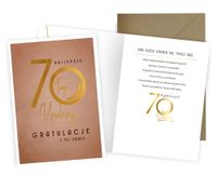 Karnet Vision "Urodziny 70" V-014 W powiększonym tzw. Angielskim formacie 140x190 mm. Wykonane z niezwykłą dbałością o szczegóły, zdobione folią holograficzną i w całości pokryte folią matową dla podkreślenia efektu prostoty i elegancji. Wewnątrz znajduje się tekst życzeń, a całość uzupełnia dedykowana złota koperta. Należą do pięknej kolekcji urodzinowej simplyWHITE,
