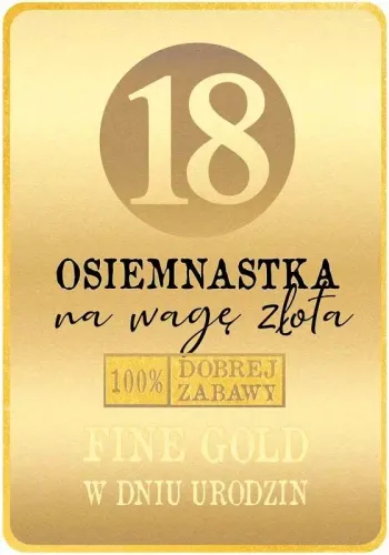 Kartka Dream Cards na Osiemnastkę "Osiemnastka na wagę złota" DK-1291 Kartka B6 z ozdobnej serii Dream Cards - nieduża, ale robi wrażenie dzięki atrakcyjnej kolorystyce i ciekawym zdobieniom. To idealny wybór łączący przyjazną cenę z jakością. Cechy szczególne: wielkość: B6, 16.6 x 11.7 cm po złożeniu, koperta: w zestawie, kolorowa, zdobienia: kolorowe, różnorodne, bogate (w zależności od wzoru: przyklejane dekoracje, elementy biżuteryjne, odstawniki, metaliczne folie, tłoczenia itp.), okazja: osiemnastka, urodziny