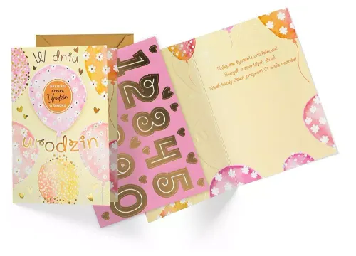 Kartka Dream Cards "W dniu urodzin" DK-1307 Kartka B6 z ozdobnej serii Dream Cards - nieduża, ale robi wrażenie dzięki atrakcyjnej kolorystyce i ciekawym zdobieniom. To idealny wybór łączący przyjazną cenę z jakością. Cechy szczególne: wielkość: B6, 16.6 x 11.7 cm po złożeniu, koperta: w zestawie, kolorowa, zdobienia: kolorowe, różnorodne, bogate (w zależności od wzoru: przyklejane dekoracje, elementy biżuteryjne, odstawniki, metaliczne folie, tłoczenia itp.), okazja: urodziny