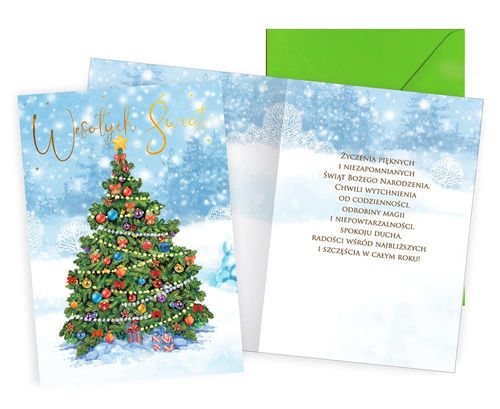 Karnet Passion Plus PP-2262 Boże Narodzenie Kartka wielkości B6, zdobiona w zależności od wzoru metaliczną folią lub brokatem. Każda kartka posiada kolorowe życzenia w środku i dopasowaną kopertę w komplecie. Wymiary karnetu po złożeniu: 11,7 x 16,6 cm.