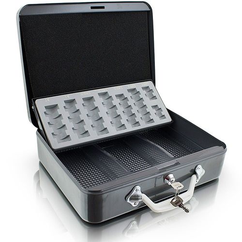 Zapewnij sobie spokojny umysł, mając pewność, że Twoje monety, banknoty oraz inne wartościowe przedmioty są odpowiednio zabezpieczone. Kasetka o wymiarach 300mm x 240mm x 90mm (długość/szerokość/wysokość) oferuje mnóstwo miejsca na różne akcesoria, a ergonomiczny uchwyt ułatwia transport – nawet w najbardziej wymagających sytuacjach!