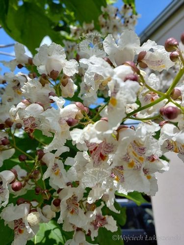 W okresie letnim Katalpa zaskakuje białymi kwiatami, które zbierają się w zachwycających wiechowatych kwiatostanach o długości do 30 cm. Kwiaty te pojawiają się zwykle w lipcu, przyciągając uwagę nie tylko ogrodników, ale także pszczół i motyli, co dodatkowo wzbogaca Twoje otoczenie o życie natury.