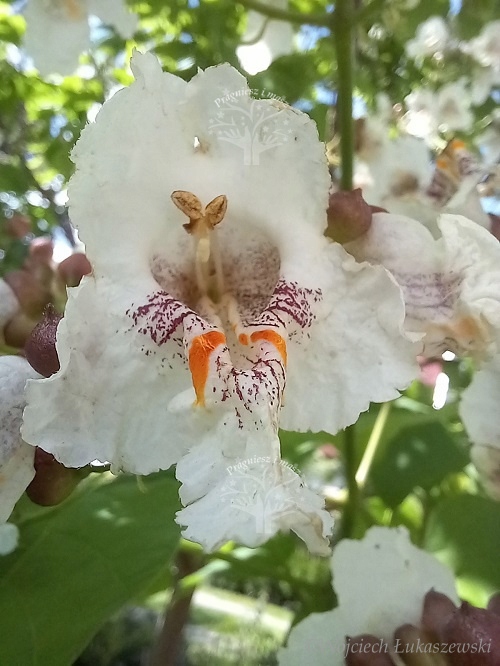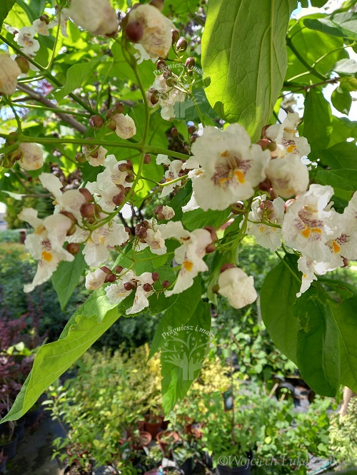 Bardzo efektowna odmiana surmii bignoniowej - Catalpa bignonioides (pojemnik C3). Drzewo wraz z wiekiem nabiera coraz bardziej zaokrąglonych kształtów i po kilku latach może pochwalić się wyjątkowo kształtną, owalną koroną.