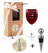 Kieliszek o pojemności 350 ml i wysokości około 20 cm, z grawerem wyczuwalnym pod palcami, zapewnia niezawodne użytkowanie bez obaw o zarysowania czy blaknięcie. Kork do wina z silikonową nakładką uszczelnia butelki o różnych średnicach, zachowując świeżość wina na dłużej, co czyni ten zestaw niezastąpionym towarzyszem spotkań i chwil relaksu.