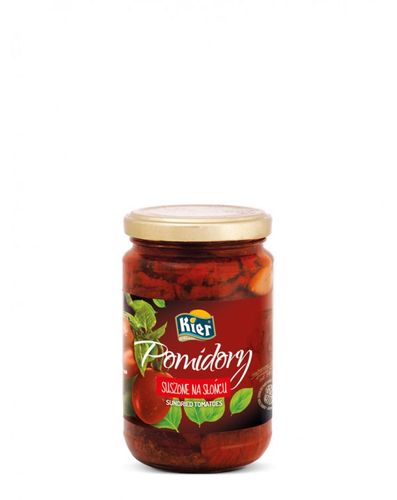 Suszone pomidory na słońcu (połówki), olej rzepakowy, sól, przyprawy, czosnek, kapary, regulator kwasowości: kwas octowy i kwas cytrynowy, przeciwutleniacz: kwas askorbinowy (witamina C)