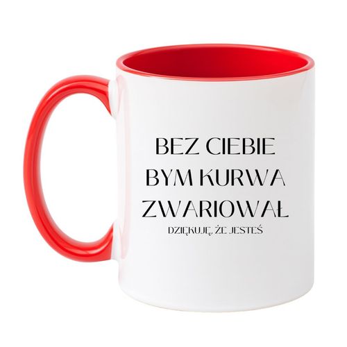 Kubek bez ciebie bym kurwa zwariował to ceramiczny kubek z humorystycznym nadrukiem, stworzony jako praktyczny i zapamiętywalny prezent od mężczyzny dla ważnej kobiety w jego życiu. Ten model najlepiej sprawdzi się jako upominek dla dziewczyny, żony, narzeczonej, partnerki albo bliskiej kobiety, z którą łączy Cię mocna relacja, wspólny język i swobodny humor. Napis „Bez ciebie bym kurwa zwariował” zamienia zwykły kubek w śmieszny prezent z emocją, który jednocześnie bawi i mówi coś naprawdę ważnego.