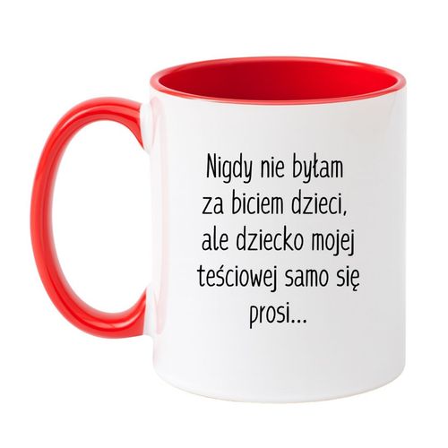 Kubek „Nigdy nie byłam za biciem dzieci, ale dziecko mojej teściowej samo się prosi” to doskonały wybór dla tych, którzy z dystansem podchodzą do relacji rodzinnych, szczególnie tych z teściami. Ten napis jest pełen humoru, który doskonale odzwierciedla sarkastyczne podejście do pewnych życiowych sytuacji. Z pewnością wywoła uśmiech na twarzy każdego, kto zna teściową i dzieci w rodzinie.