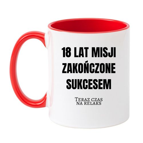 Dzięki temu śmieszny kubek dla rodzica 18-latka „18 lat misji zakończone sukcesem” wyróżnia się na tle standardowych kubków prezentowych.