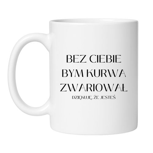 Kubek bez ciebie bym kurwa zwariował to ceramiczny kubek z humorystycznym nadrukiem, stworzony jako praktyczny i zapamiętywalny prezent od mężczyzny dla ważnej kobiety w jego życiu. Ten model najlepiej sprawdzi się jako upominek dla dziewczyny, żony, narzeczonej, partnerki albo bliskiej kobiety, z którą łączy Cię mocna relacja, wspólny język i swobodny humor. Napis „Bez ciebie bym kurwa zwariował” zamienia zwykły kubek w śmieszny prezent z emocją, który jednocześnie bawi i mówi coś naprawdę ważnego.