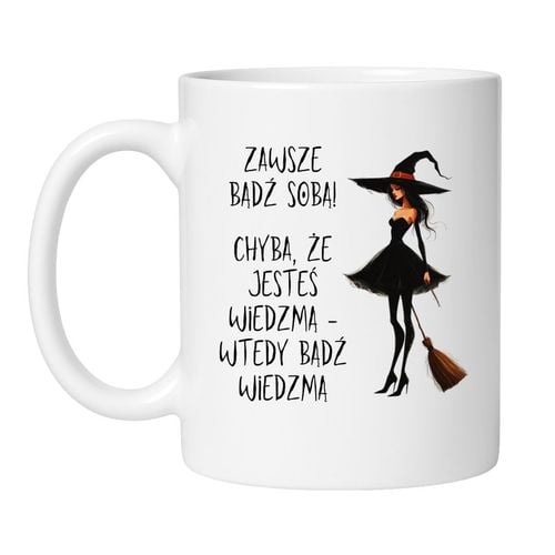 Bo po co być zwykłą, skoro można być magiczną? Ten kubek to manifest kobiecej mocy, ironii i dystansu do świata. Zabawny napis „Zawsze bądź sobą, chyba że jesteś wiedźmą – wtedy bądź wiedźmą” idealnie pasuje do kobiet, które nie potrzebują księcia, żeby ogarnąć własne królestwo (i zrobić poranną kawę z eliksiru mocy).
