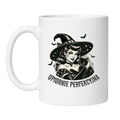 Niektórzy mają wady. Ty masz… czar. Kubek „Upiornie perfekcyjna” to hołd dla kobiet, które potrafią być czarujące, groźne i idealne w jednym łyku kawy. Zjawiskowa grafika retro wiedźmy z kotem, nietoperzami i magicznym wdziękiem sprawia, że ten kubek to nie tylko naczynie — to styl życia.