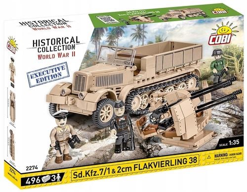 Piaskowy kolor, zmieniona konstrukcja pojazdu dostosowana do przewożenia poczwórnego działa przeciwlotniczego 2cm Flakvierling 38, dodatkowa figurka oficera Afrika Korps i jeszcze więcej ciekawych nadruków to cechy odróżniające EXECUTIVE EDITION od wersji standardowej! Sd.Kfz.7 był produkowany przez przemysł niemiecki w wielu wersjach. Zestaw COBI to świetna baza do dalszych fanowskich modyfikacji!