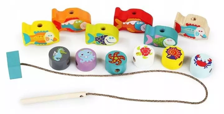 Zestaw składa się z 12 rybek i innych zwierzątek morskich, sznurka z ogranicznikiem na końcu i długą drewnianą igłą, 8 kart z zadaniami. Gra może być oferowana dzieciom już od 18 miesięcy. Na początku dziecko próbując włożyć igłę do dziury zaczyna rozumieć zasadę przeciągania. Gdy umiejętność przeciągania jest w pełni opanowana, dzieci skupiają się na tym, by nawlekać poszczególne części w określonej kolejności, zgodnie z zadaniami na kartach. W ten sposób dziecko uczy się logicznego myślenia, możliwości przeniesienia rysunku na inny obszar. Zabawy w nawlekanie doskonale rozwijają zdolności motoryczne, stymulują ośrodki mózgu odpowiedzialne za mowę. Gra jest zapakowana w kompaktowe pudełko, które jest wygodne do podróżowania. mWszystkie klocki marki Cubika powstają w ekologicznie czystym rejonie Karpat z wysokiej jakości litego drewna, takiego jak buk i jawor, oraz atestowanych nietoksycznych niemieckich farby na bazie wody. Wszystkie zestawy posiadają wymagane prawnie atesty i spełniają międzynarodowe standardy jakości.