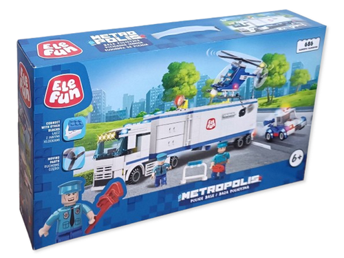 Klocki Elefun Metropolis - Mobilna baza policyjna 8828, to klocki które zapewnią dziecku wiele godzin wspaniałej zabawy, a dodatkowo wpłyną pozytywnie na kreatywność, wyobraźnię i rozwój zdolności manualnych. Klocki są kompatybilne z innymi markowymi klockami. W zestawie: Ciężarówka, naczepa, helikopter, radiowóz, 2 barierki, separator klocków, 3 figurki, papierowa obrazkowa instrukcja składania oraz zestaw naklejek do oklejenia klocków.