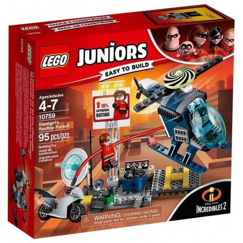 Rozbudź wyobraźnię swojego dziecka emocjonującymi zestawami z serii LEGO® Juniors Incredibles 2, takimi jak Pościg Elastyny. W tym pełnym akcji zestawie znajdziesz helikopter z podwoziem ułatwiającym budowanie, obracającym się hipnotyzującym śmigłem i otwieranym kokpitem. Jest tu także sekcja dachu na płytce ułatwiającej budowanie, billboard, lądowisko dla helikopterów, przeszkoda przedstawiająca turbinę z obracającym się wirnikiem oraz motor Elastyny - Elastycykl. Ten ciekawy zestaw zawiera też proste instrukcje budowania i zabawy, które pomagają poczuć się pewniej dzieciom w wieku 4–5 lat. Zestaw zawiera dwie minifigurki.