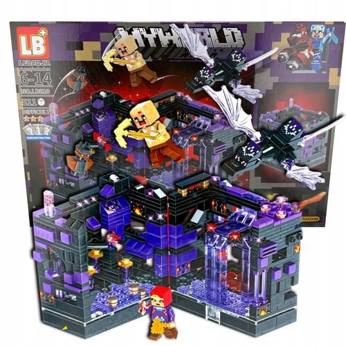 Zestaw stworzony dla fanów najmroczniejszych biomów świata Minecraft! Zbuduj potężną bazę z czarnych i niebieskich bloków, przygotuj obronę i staw czoła ogromnemu czarnemu smokowi, który atakuje Twierdzę z wymiaru Nether/End.