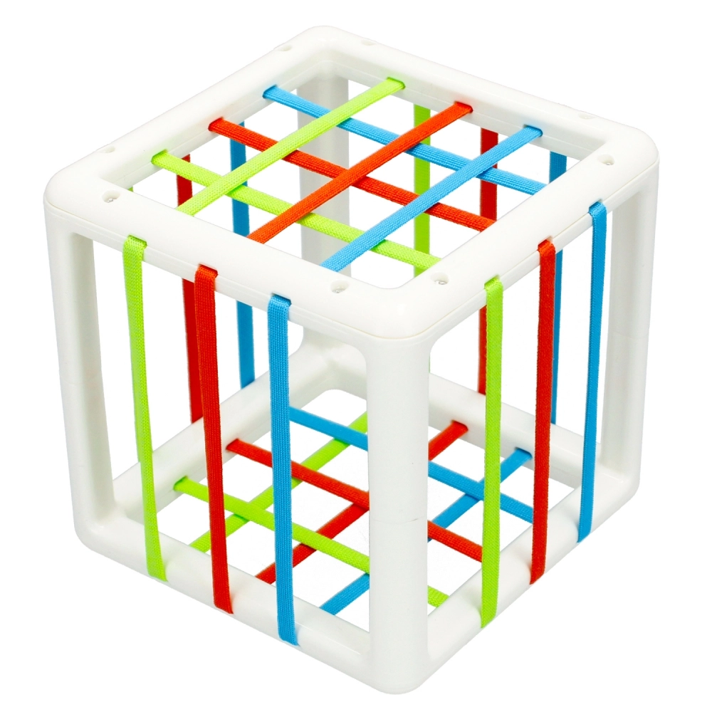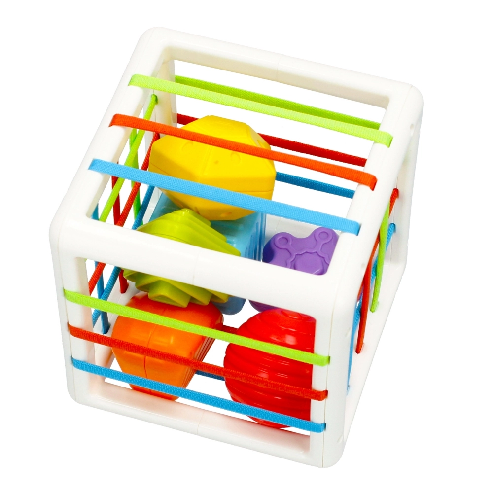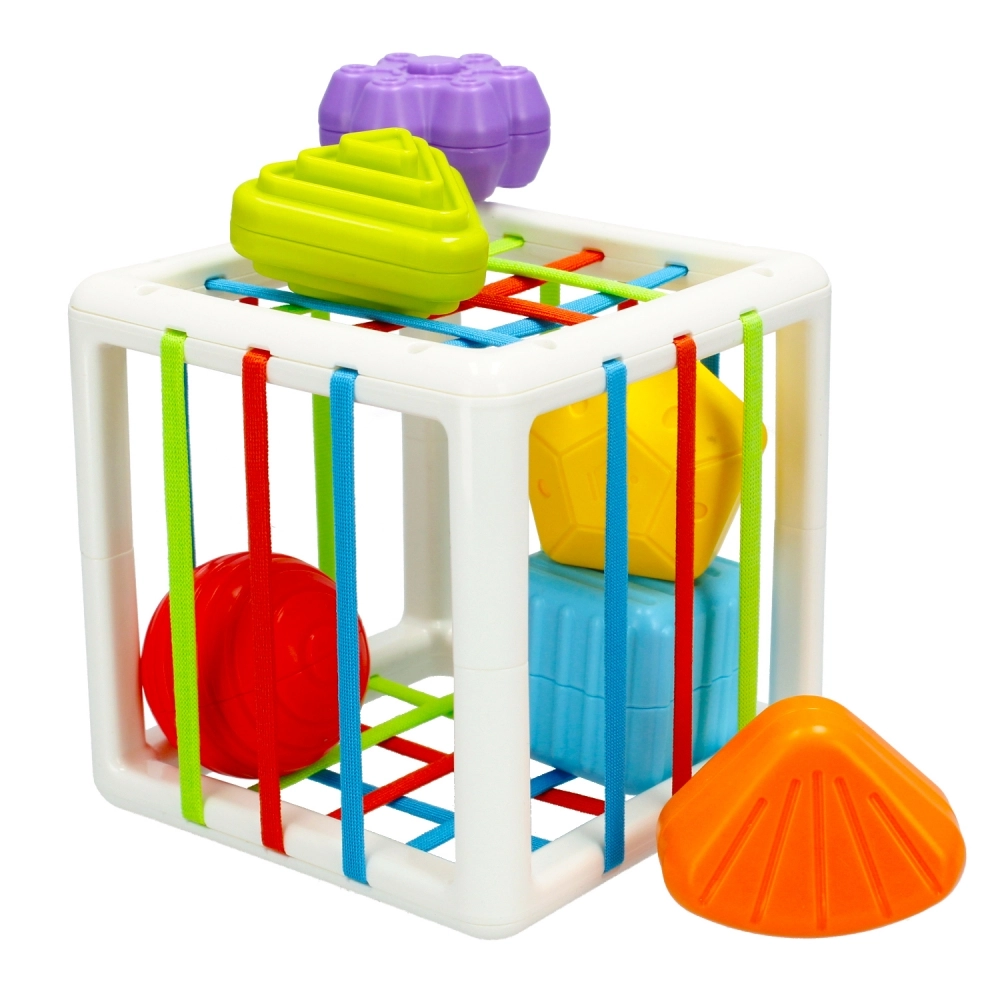 Ta nieskomplikowana zabawka w doskonały sposób zapewnia rozwój zdolności manualnych i motorycznych dziecka. Sześć bajecznie kolorowych, o różnych formach i kształtach geometrycznych klocków, przyciąga uwagę dziecka aktywizując percepcję wzrokowa, uczy rozpoznawania kształtów oraz aktywizuje zmysł dotyku i zdolności manualne. Dodatkowo sześcian, którego ścianki utkane są z kolorowych, elastycznych linek, pełni rolę sortera, do którego bez trudu można wrzucać klocki i przechowywać je tam. Ponowne wyjęcie klocków wymaga sporej koncentracji, zaangażowania malucha, uczy wytrwałości gratyfikując włożony wysiłek. Zabawka wpływa pozytywnie na emocje, zapewnia relaks i kreatywną zabawę, pomaga w nauce kolorów oraz kształtów. Zabawka wykonana z najwyższej jakości plastiku, bez ftalanów, zgodna z EN-71 i CE. Zapewnia bezpieczną zabawę. Wymiary zabawki: 12.0 x 12.0 x 12.0 cm Wymiary opakowania: 13.0 x 18.0 x 13.0 cm