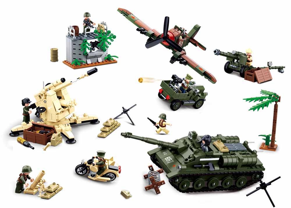ZESTAW: CZOŁG, SAMOLOT, AUTO WOJSKOWE, 2X DZIAŁO, MOTOCYKL, 9X LUDZIKI