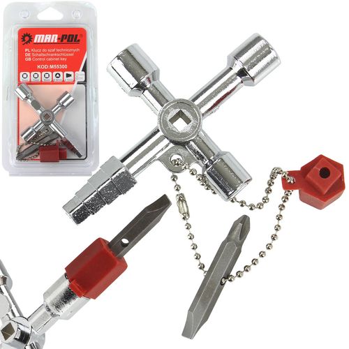 Uniwersalny klucz wyposażony w końcówki do otwierania i zamykania większości popularnych systemów skrzynek oraz szaf sterowniczych.