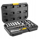 Z 36 precyzyjnie wykonanymi elementami, w tym szeroką gamą nasadek, końcówek wkrętakowych oraz grzechotką, ten zestaw jest odpowiedzią na każde wyzwanie, z jakim możesz się zmierzyć podczas drobnych prac montażowych, napraw pojazdów, maszyn i innych projektów domowych lub garażowych.