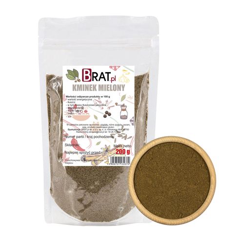 W każdym opakowaniu znajdziesz 200g kminku mielonego, co sprawia, że jest to produkt bardzo wydajny. Skład produktu to 100% kminek, bez jakichkolwiek dodatków czy substancji chemicznych.