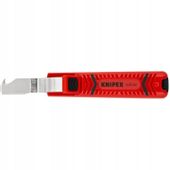 Ostrze w kształcie haka z nasadką ochronną umożliwia efektywne ściąganie izolacji z różnych typów przewodów okrągłych. Samonapinający się element obejmujący przewód oraz pokrętło regulujące głębokość nacinania izolacji zapewniają precyzyjną kontrolę i łatwość obsługi.