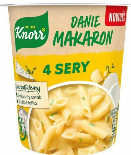 Knorr Danie makaron - 4 sery w kubku to szybki i smaczny posiłek gotowy w kilka minut. Idealne połączenie czterech serów sprawia, że makaron jest kremowy i pełen smaku. Chcesz szybko zaspokoić głód? Wybierz makaron z serem marki Knorr i ciesz się pysznym posiłkiem w wygodnej formie.