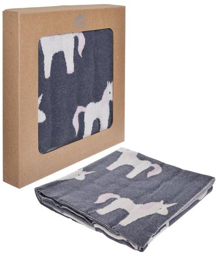 Miękki, bawełniany koc dziecięcy w jednorożce. Skład: 100% bawełna.