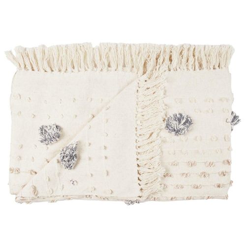Koc Tuffo wykonany jest z wysokiej jakości poliestru, co zapewnia nie tylko komfort użytkowania, ale także trwałość na długie sezony. Jego kremowy kolor sprawia, że pasuje do każdego wnętrza, dodając mu elegancji i klasy. Ozdobione frędzelkami i stylowymi pomponami w granatowo-szarym kolorze, wnosi do przestrzeni nutkę boho, stając się nie tylko praktycznym kocem, ale także efektowną dekoracją Twojego salonu lub sypialni.