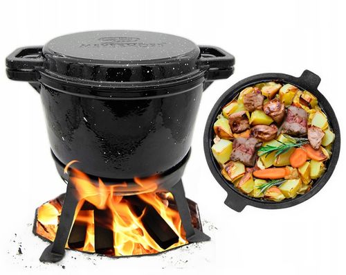 Kociołek składa się z trzech elementów: garnka, pokrywy pełniącej rolę grilla oraz podstawki. Ta wielofunkcyjność pozwala na przygotowanie różnorodnych potraw, od duszonych po grillowane.