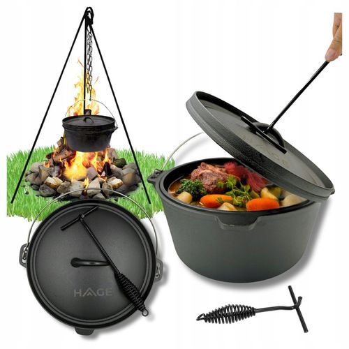 Kociołek ten łączy wszechstronność z niezawodnością, umożliwiając użycie jako wiszący na trójnogu lub stojący na ruszcie czy żarze – bez kompromisów w jakości. Dzięki solidnej konstrukcji i wypalonemu żeliwu, gotowe jest od razu do akcji, oferując bezpieczeństwo i długoletnią wytrzymałość, która przetrwa niezliczone spotkania przy ogniu, zawsze dostarczając potrawy o głębokim, autentycznym smaku.