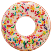 Dmuchane koło do pływania firmy Intex w kształcie donuta oblanego białą czekoladą i posypanego posypką o średnicy 99 cm.