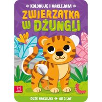 Kreatywna książeczka dla młodszych przedszkolaków - dzieci poznają zwierzęta mieszkające w dżungli: krokodyla, słonia, małpkę, papugę, tygrysa, leniwca i nosorożca; kolorują te zwierzęta oraz je wyklejają, a także słuchają i uczą się wierszyków o zwierzakach z książki. Doskonała zabawa sensoryczna i manualna - sposób na owocne spędzenie czasu przez dziecko.