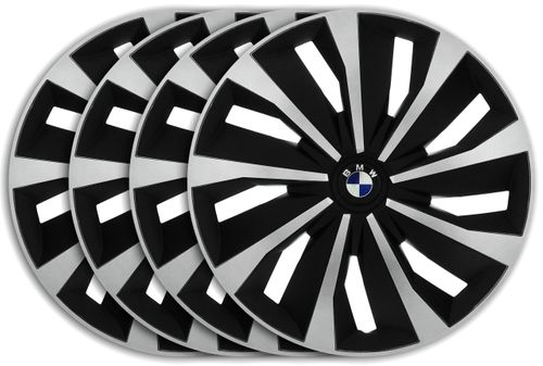 Zestaw czterech (4) nowych 15" KOŁPAKÓW model GRIP PRO w kolorze SREBRNO-CZARNYM z najwyższej jakości EMBLEMATAMI BMW.