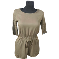 Damski kombinezon z krótkimi spodenkami marki Pimkie to praktyczna propozycja na ciepłe dni, łącząca swobodę noszenia z estetycznym wyglądem. Został wykonany z lekkiego materiału, który zapewnia odpowiednią cyrkulację powietrza, co czyni go funkcjonalnym wyborem na wakacyjne wyjazdy, spacery oraz codzienne letnie aktywności. Luźny krój konstrukcji gwarantuje pełną swobodę ruchów, a brązowa kolorystyka pozwala na łatwe dopasowanie odzieży do różnorodnych elementów garderoby. Produkt charakteryzuje się starannym wykończeniem i jest oferowany jako odświeżony oraz ometkowany w ramach profesjonalnego serwisu, co potwierdza jego gotowość do użytkowania.