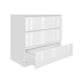 Biała komoda z błyszczącym wykończeniem optycznie powiększy Twoje wnętrze. Jej elegancki blat doskonale nadaje się do eksponowania drobnych bibelotów. Wyposażona w sprawdzone rolkowe prowadnice, ta nowoczesna komoda oferuje wysoki komfort użytkowania dzięki łatwemu dostępowi do zawartości szuflad. Jej solidna konstrukcja z płyty wiórowej zapewnia wytrzymałość na lata.
